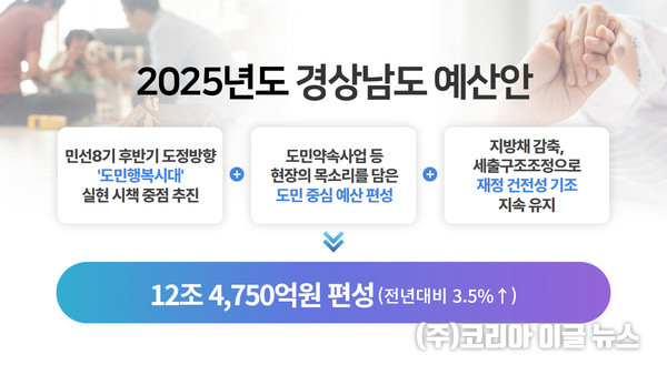 경상남도, 2025년 예산안 ’12조4755억원’ 경상남도, 2025년 예산안 ’12조4755억원’ – 민선 8기 후반 도청 방향, ‘시대실현 정책추진에 집중’ 시민행복 – 현장 주민 등에 대한 약속 시민의 목소리로 시민 중심 예산 우선화 – 지역감소 경상남도는 지출구조조정을 통해 재정건전성을 지속적으로 유지하고 있습니다. 경상남도는 2025년 예산을 전년보다 4,181억원(3.5%) 증가한 12조4,750억원으로 확정했다고 밝혔다. 경기침체의 점진적인 회복이 예상되는 상황에서 2025년 정부예산안의 세수는 전년 대비 6.5%…
