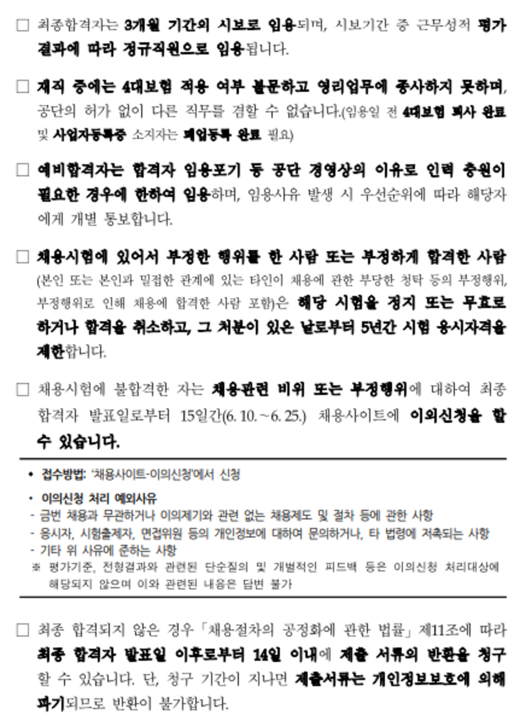 예: “프로젝트 팀장으로서 팀원 간의 갈등을 조정하고 각자의 의견을 듣고 최적의 솔루션을 고안했습니다.”3. 필기시험 경쟁률 및 준비방법 경쟁률 : 필기시험의 경우 경쟁률이 약 2배 높음. 시험과목 : 기초직업능력평가(NCS 기반 문항) 종합직무지식평가(행정, 경영, 경제 등) ) 인성검사 컴퓨터 실기시험 ( 컴퓨터 직종에 한함 ) 준비방법 기본직무능력평가 : NCS 기반의 문제풀이, 자료해석, 논리적 사고력 훈련이 많이 요구됩니다. 직무지식 종합평가 : 직무에 적합한 직무지식(예: 행정, 사무직 경영), 경제학 등) 인성검사 : 자신의 가치관과 생각을 솔직하게 표현해야 합니다.