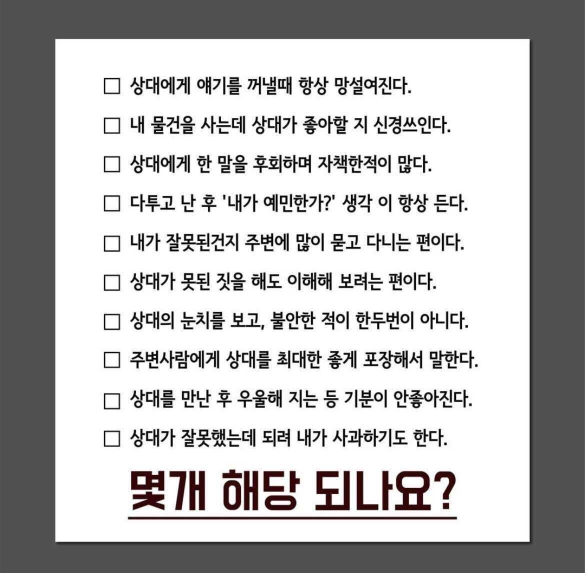 가스라이팅 데이트. 지금 이 순간에도 자신이 가스라이팅을 당하고 있다는 사실조차 모르고 행복하다고 믿으며 살아가는 사람들이 있다. 우리 주변에는 가스라이팅을 당하는 사람들이 많이 있습니다. 그래도 그들은 이상한 점을 느끼지 않습니다. 왜? 길들여졌기 때문이죠. 물론 처음에는 이상하게 느껴졌을 수도 있지만, 계속 세뇌하다 보면 그렇게 생각하게 되고, 상대방의 조종에 익숙해지고 심지어 사랑이라고 착각하기도 해서 이상하게 느껴지지 않게 된다. 모두 계속해서 연애 관계를 유지하세요. 사람들은 가스라이팅을 사용합니다. 맞고 있다고 생각하면 인지하고 있다고 생각하겠지만 그렇지 않습니다. 대부분의 사람들은 그것을 깨닫지 못합니다. 그들은 교묘하게 상대방에게 길들여졌기 때문에 그것이 나쁜 상황이라는 것을 모르고 서로 사랑하기 때문이라고 생각하고 그냥 무시한다. 오히려 가스라이팅을 당하고 있다며 그 남자(여자)와 연애를 그만둬야 한다고 말하는 사람들에게 화를 내기까지 합니다. 그 사람을 이미 자신의 감정도 포함해서 포기하고, 어떤 목적으로 만나든, 무엇을 원하든 그 사람을 사랑하고 들어준다고 믿고 있다는 사실이 아이러니합니다. 관계에서의 가스라이팅. 가스라이팅을 당하고 있는 것 같다면 주저하지 말고 헤어지세요. 솔직히 말하면 단어 자체가 모호해서 익숙해질 때쯤이면 이미 세뇌가 진행되어 빠져나올 수 없게 된다. 조금만이라도 몸과 마음을 통제하려는 것 같다면 더 이상 의심하지 말고 피해야 한다. 똥 냄새가 나면 피해야 하지만, 냄새가 난다고 해도 만질 때쯤에는 이미 냄새에 익숙해져 피할 수 없게 됩니다. 더러운 비유를 용서해주십시오. 그러나 이것만큼 적절한 비유가 있는지 궁금합니다.