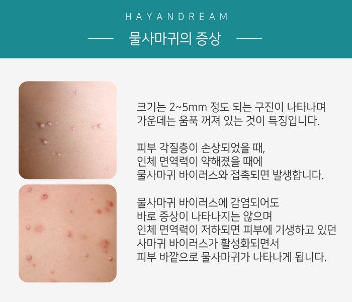 물사마귀는 수두 바이러스의 일종인 연체동물 바이러스에 감염되어 피부에 발생하는 감염성 피부질환을 말합니다. 물사마귀가 나타난 직후가 아니라, 이미 다른 부위로 퍼진 후에 병원을 찾는 분들이 많습니다.