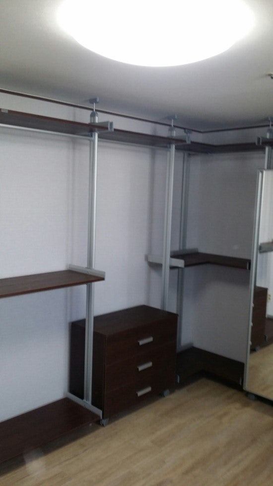 입구 옆 팬트리실에 웨이트 시스템 행거를 설치해서 드레스룸으로 사용했는데 공간이 너무 좁아서 양쪽에 코너 수납장을 배치하여 두 개의 물품을 더 넣을 수 있었습니다. L자형 코너수납장 외에도 긴 옷을 걸어둘 수 있는 곳도 있어요. 접힌 옷을 정리할 수 있도록 2단 서랍과 3단 수납장을 추가했습니다. 컬러는 월넛으로 하여 중후한 느낌을 주었어요. 아주 깔끔하게 설치되었네요. E0등급으로 포름알데히드 등 유해환경호르몬으로부터 안전합니다. 존재하는 제품입니다.