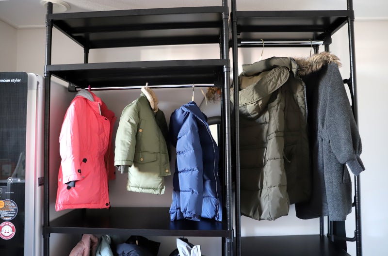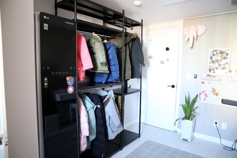 작은방에는 기존 서랍장을 창가에 배치하고 시스템행거를 L+1 형태로 배치하였습니다. 출입문 옆에는 3피스 스타일러도 배치해 외출 후 바로 옷을 살균, 정리할 수 있도록 했다. 2단 서랍장 행거 하단 선반을 제외하고 모두 2단 옷걸이로 구성되어 있습니다.