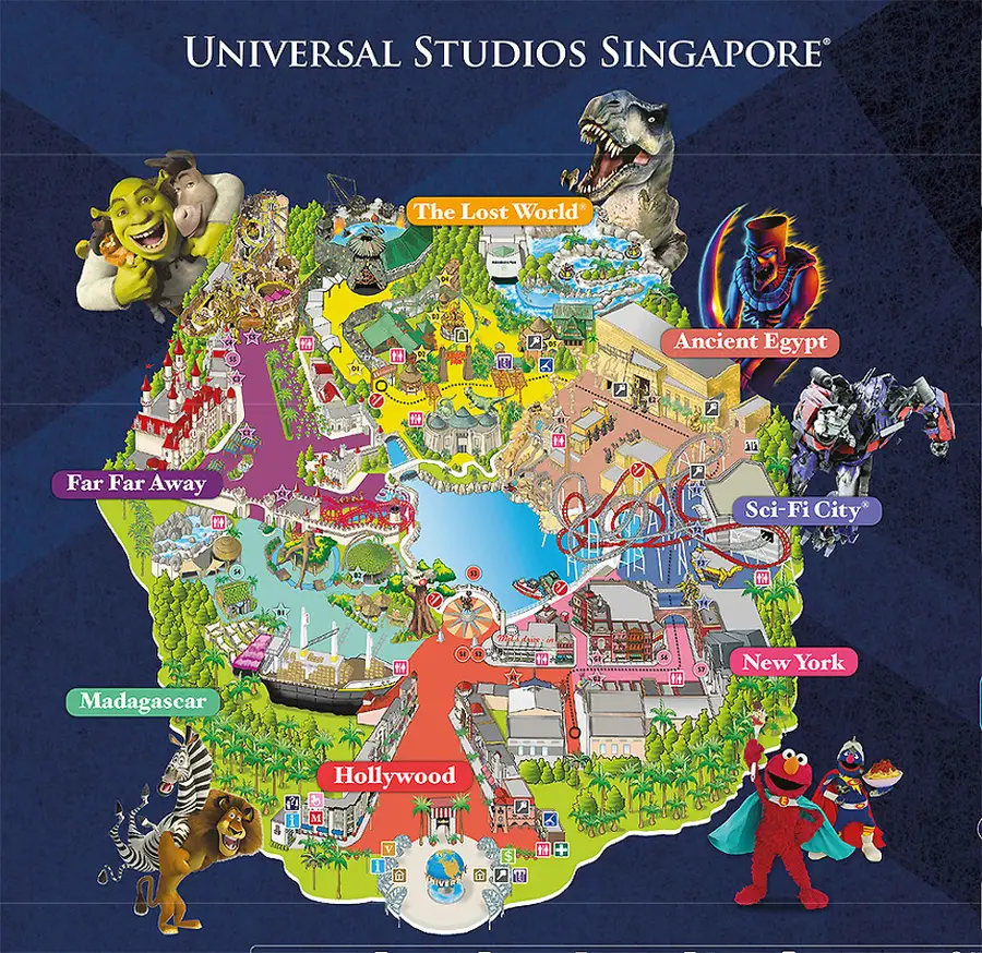 공원 지도는 유니버설 웹사이트에서 찾거나 Google에서 싱가포르 유니버설 스튜디오 지도를 검색하여 찾을 수 있습니다. 입장하시면 헐리우드에 입장하게 됩니다. 우회전하여 필수 명소에 빠르게 탑승한 후 다시 직진하여 천천히 둘러보고 사진을 찍을 수 있어 대기 시간을 줄여 효율적으로 둘러볼 수 있습니다. 필수 명소