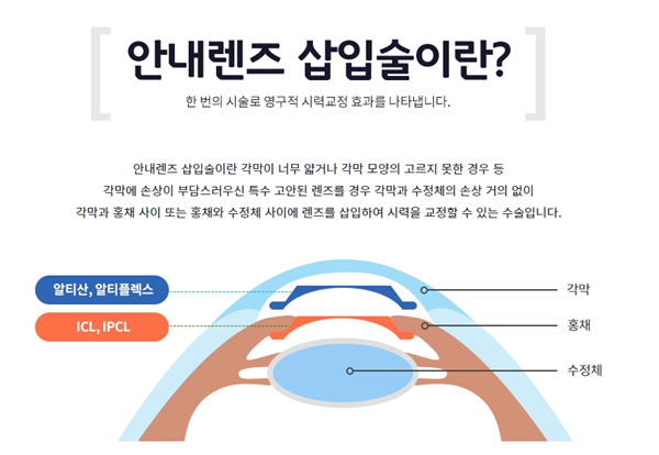 안구내 렌즈삽입술은 홍채와 수정체 사이에 특수렌즈를 삽입하고, 홍채에 특수렌즈를 고정시켜 저하된 시력을 교정하는 시력교정수술입니다. 각막을 절개하는 라식이나 라섹과 달리 각막을 그대로 보존합니다. 렌즈는 가장자리의 작은 절개를 통해 삽입됩니다. 눈에 렌즈를 넣는 것 자체에 대한 두려움을 느끼시는 분들도 계시지만, 인공수정체 이식은 2002년 도입된 이후 국내에서만 18만 건이 넘는 사례가 있을 정도로 안전하며 수준 높은 시력교정 수술입니다. 따라서 각막 절개로 인해 발생할 수 있는 안구건조증, 원추각막, 근시변성 등의 부작용이 발생할 위험이 낮습니다. 문제가 발생한 경우, 삽입된 렌즈를 제거하는 것만으로 원래 상태로 복원할 수 있습니다. 가능하다는 점도 장점으로 꼽힌다.