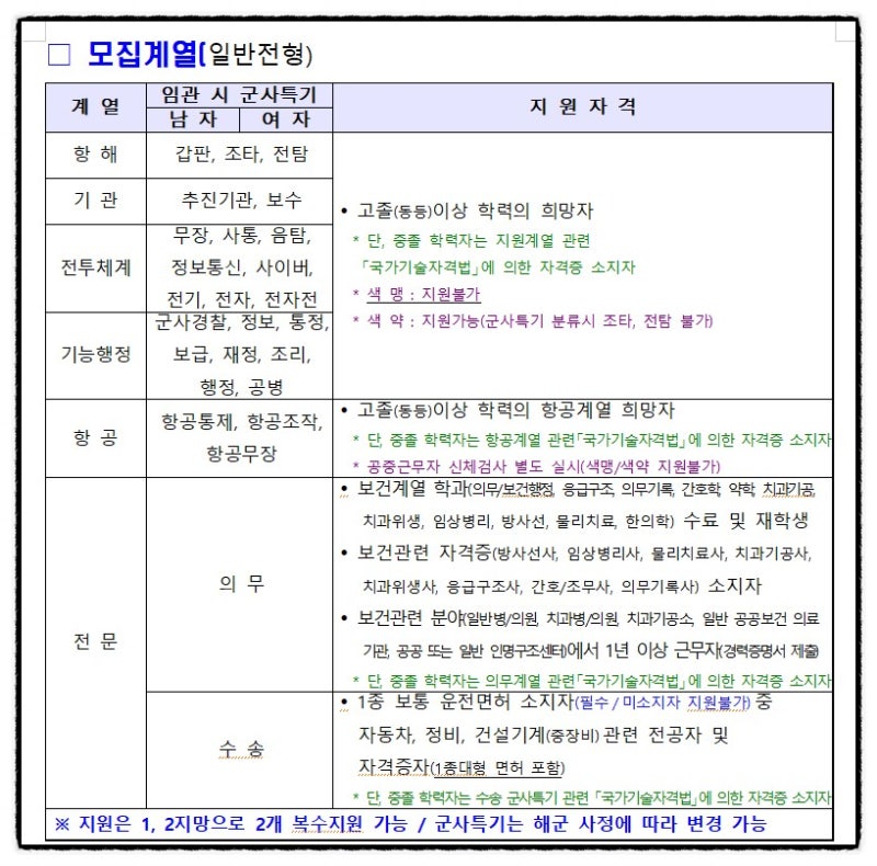 모집시리즈 해군부사관 모집시리즈 일반 남녀 선발 취직 후 군 전공에 따라 지원자격을 검토하게 됩니다. 항법은 갑판, 조타, 전투엔진은 추진엔진, 보수적인 전투체계는 군비, 화력, 음파탐지, 정보통신, 사이버, 전기, 전자, 전자전 기능 행정은 헌병, 정보, 항공통제, 항공운항, 항공무장항행, 엔진, 전투체계, 기능행정, 항공 분야의 항공공학 자격은 다음과 같습니다. – 고등학교 졸업(동등학력) 소지자 동급) 이상 – 국가기술자격법에 의한 자격증 소지자 색맹 색맹이신 분은 지원하실 수 없습니다. 다만, 군사특기로 분류된 경우 조종이나 전투는 허용되지 않는다. 전문직(필수)은 보건 관련 학과를 이수했거나 현재 재학 중이거나, 보건 관련 보유자가 있거나, 보건 관련 분야에서 1년 이상 근무한 경력이 있는 사람이어야 합니다. 전공(교통)은 일반운전면허 1종을 소지하고 자동차, 정비, 건설기계 전공이 있어야 합니다. 해군 부사관으로서 군사 특수 기술을 1지망 또는 2지망으로 여러 지원서에 지원할 수 있습니다. 특별전형은 1차 선발을 위한 필기시험입니다. 면제로 인해 서류심사로 대체되며, 2차 전형에서는 신체검사와 면접을 실시하게 됩니다. 다만, 관련된 군 전공이 많아 모두 나열하기 어려우므로, 자세한 모집 계획은 직접 확인하시기 바랍니다. 1차 필기시험, 해군 부사관 시험, 평가를 실시합니다. 항목별 130점 배점을 기준으로 KIDA 임원선출도구 100점, 언어논리 및 데이터 해석 각 35점, 공간능력, 지각속도, 상황판단 각 10점, 직무특성은 100점을 배분한다. 인터뷰를 통해 참고하고, 한국사 30점. 포인트가 할당됩니다. 언어논리 및 데이터 해석 중 하나 이상에서 점수가 30% 미만인 경우 실격 처리됩니다. 2차 신체검사, 인성검사, 면접 점수는 대면 80% + AI 면접 20%로 진행되며, 1차 점수가 0점이거나 평균점수가 50% 미만일 경우 불합격 처리됩니다. 공군에서는 부사관이 남자, 여자 모두 지원이 가능하고 빠른 합격을 위해서는 면접이 매우 중요하기 때문에 인기가 높습니다. 학력, 시험, 체력 등은 큰 차이가 없으나 면접은 대면으로 진행됩니다. 보시다시피, 심사위원의 주관적인 평가 기준을 충족하지 못하면 낮은 점수를 받을 수밖에 없습니다. 지원자가 늘어나고 경쟁률이 높아질수록 더 준비된 인재를 채용하기 위해서는 남들보다 더 준비할 수 있는 요소를 평가하며, 개인의 역량과 능력이 상당히 중요하게 여겨집니다. 나는 그것을 보고 있다. 한마디로, 차별화된 경쟁력이 없으면 면접에서 좋은 점수를 기대하기 어렵습니다. 군인전문자격, 국방부 인정 군사심리상담강사, 군지도자, 지도사, 생명존중교관, 교관위원회의 3개 항목은 한국직업능력개발원에 공식 등록되어 있으며, 교육과학기술부장관이 직접 승인한 자격증입니다. 국방부. 획득 과정에서 전문적인 이론을 배우고 군사 조직에 참여하게 됩니다. 해당 분야에 대한 이해도를 높여 개인의 역량과 능력을 인정받으면서 면접에서도 좋은 평가를 기대할 수 있습니다. 국방부는 더 많은 인재를 육성하고 전문성을 갖춘 우수한 인재를 채용하기 위해 개인의 능력 향상 기회를 제공하고 있습니다. 육군교육원에서는 군 전문 강사들의 검증된 강의를 통해 체계적으로 학습하고, 고도로 짜여진 커리큘럼으로 쉽고 빠르게 습득할 수 있습니다. 필수경쟁력 확보를 위한 면접 질적 가산점 / 군 지휘교관 취득 시 ROTC 0.5점 가산점 현역장교, 부사관 각 부대 활용 국방인사정보시스템 개인자격 – 자격 및 면허기록 변경 시 소급 반영 육군교육 수요활동 전국 고등학교 포스터 부착 활동 전국 주요 지역 현수막 설치 활동 군부대 및 주요 교육시설과 업무 협약 완료 온라인, 오프라인 수요 증대를 위한 홍보 활동 육군에듀는 수요 증가를 위해 지속적으로 노력하고 있습니다. 증명서 발급은 일회성 행사가 아닌, 군부대에 적극적으로 반영되어 평생 따라갈 수 있는 자격이 됩니다. 현역병은 임관 후 각 부대에서 자격을 취득해야 한다. 부대 인사과에 보고되기 때문에 각 육·공군이 다수의 부대에 반영되며, 현역병 역시 2021년 약 1,400여 건을 취득했다. 여전히 Army Edu 혜택이 필요하며 언제 취득해야 합니까? 과정이 무엇인지 모르는 분들이 많기 때문에 글로 설명하는 것보다 말로 설명을 듣는 것이 그 필요성을 더 잘 이해할 수 있습니다. 따라서 문의하시면 진로, 자격증 문의, 면접 코칭 등 상세한 상담을 해드립니다. 또한, 문의하시면 진로, 자격증 문의, 면접 코칭 등 상세한 상담을 해드립니다. 시험자료를 제공하고, 요청 시 할인코드를 제공하여 수강신청 시 보다 저렴한 가격으로 수강하실 수 있어 부담이 줄어듭니다. 육군교육과 함께 장교가 되겠다는 목표를 달성하시길 바랍니다.