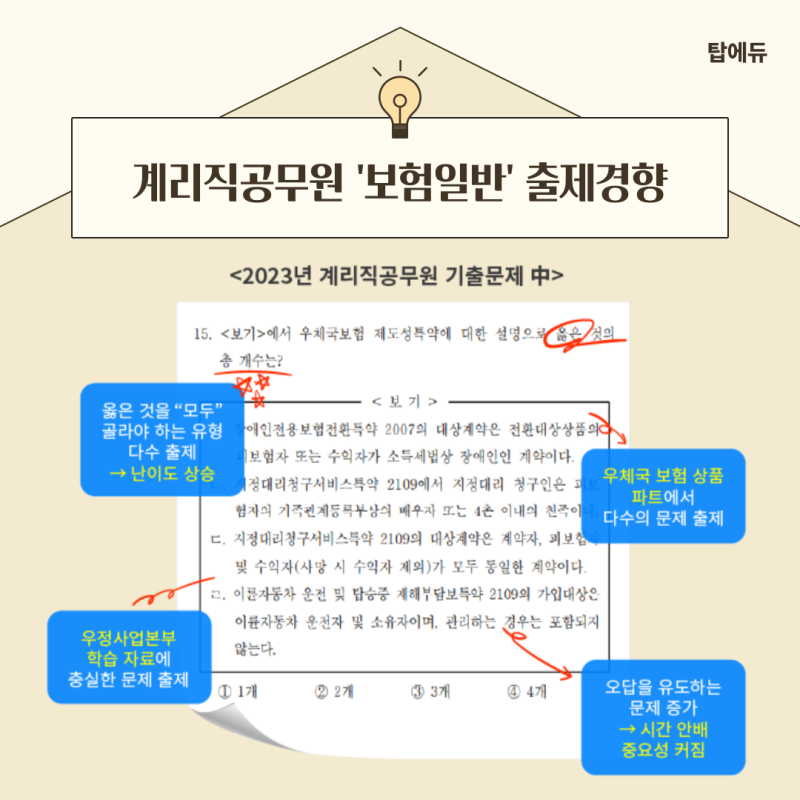 이번 공지에 따른 우체국계리직 경쟁률은 어쨌거나 지원서 제출 기준입니다! 실제로 시험장에 가서 시험을 치르는 사람의 평균 비율은 60% 정도에 불과하기 때문에 실제 경쟁률은 22:1 정도가 될 것으로 예상할 수 있어요! 어떠한 경우에도 내가 지원한 지역에서 선발인원이 감소하거나 경쟁률이 높아져도 아무런 변화가 없습니다. 남은 기간 후회 없이 준비해서 최종 합격을 하는 것이 중요하니까요! 2024년 보험계리직 시험이 7월 20일에 치러집니다. 이때는 기초부터 시작하기에는 조금 늦었고, 이론 공부의 비중을 어느 정도 줄이고 본격적으로 문제 해결을 시작해야 합니다. 이제 두 달도 채 남지 않은 지금, 합격 여부를 결정하는 매우 중요한 시기입니다! 지금까지 해오던 공부의 흐름을 이어가며 계획대로 차질 없이 준비해야 합니다! 특히, 시험 합격에 변수가 될 수 있는 기초 영어 공부는 꼭 필요합니다! 시험 비중이 많이 늘어나서 예전처럼 공부를 빼먹으면 합격하기가 매우 어려워졌습니다! 기초영어의 특성상 기본적인 문법과 어휘는 중학교나 고등학교 수준에서도 쉽게 익힐 수 있으니 끝까지 포기하지 마시길 바라겠습니다. 우체국계리공무원 시험은 기본적으로 과목당 20문항, 총 4과목 총 80문항을 제한시간 내에 정확하게 풀어 정답을 찾는 것이 전부입니다. 그러기 위해서는 전반적인 이론을 정리한 후 기출문제를 비롯한 다양한 문제를 반복적으로 풀어가며 객관식 문제에 대한 탄탄한 노하우를 습득해야 할 때이다. 공무원 시험 특성상 시간이 매우 촉박한 만큼 시간관리가 중요하므로 실제 생활처럼 타이밍을 맞추면서 과거시험 문제를 푸는 연습을 하셔야 합니다! 점수를 최대화하려면 기본서 수백 페이지에 나오는 문제를 정확하게 기억하고 옵션에서 빠르게 답을 선택해야 합니다!