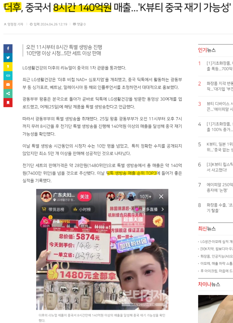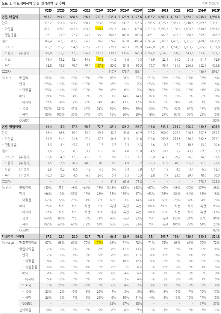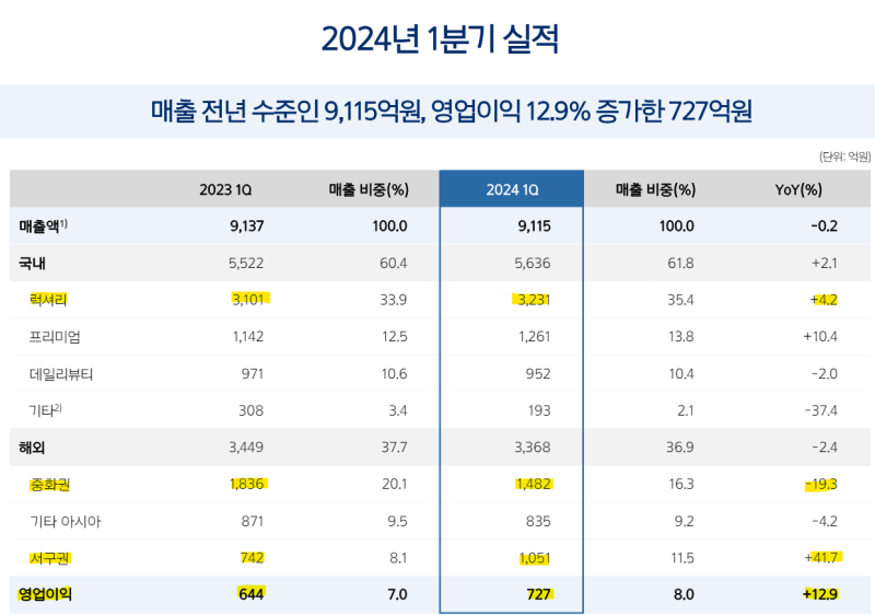 주요 수치 및 설명 2022년 1분기 이후 최대 이익 매출총이익률 +4%(71%) 중국 -20%미국/유럽 +42%럭셔리 +4%재고 조정 채널 전환 확정(백화점 등 -> 멀티- 브랜드샵), 온라인) 중국 매출은 예상보다 부진했지만 -100억 적자 발생 -> 중국 재고 마무리, 소비 회복 신호 // 아모레, 중국 소비 암시하고 코스맥스…