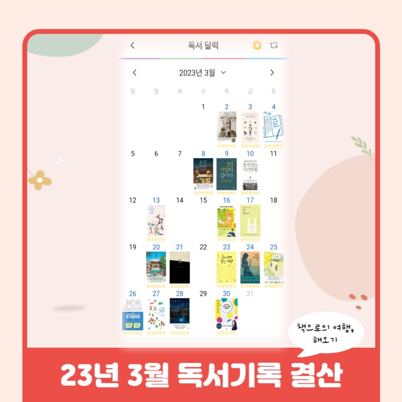 안녕하세요 칠봄위드북스 입니다. ^^벌써 3월이 지나가고… 갑작스런 손님처럼 4월이 찾아왔습니다. 꽃봉오리마저도 4월을 알아보는 것 같습니다. 여기저기에 활짝 핀 나무들이 눈을 즐겁게 합니다. ㅎㅎ 4월의 첫째 주가 지나가고 있는데 깜빡하고 있어서 빨리 읽은 내용을 요약해서 쓰려고 합니다. 나는 읽은 내용을 기록하기 위해 Book Flip이라는 앱을 사용합니다. 독서달력이 꽉 차서 보는 것은 매우 만족스러운데, 그림책이 얇고 글자도 작아서 폭넓게 읽을 수 있습니다. ^^*
