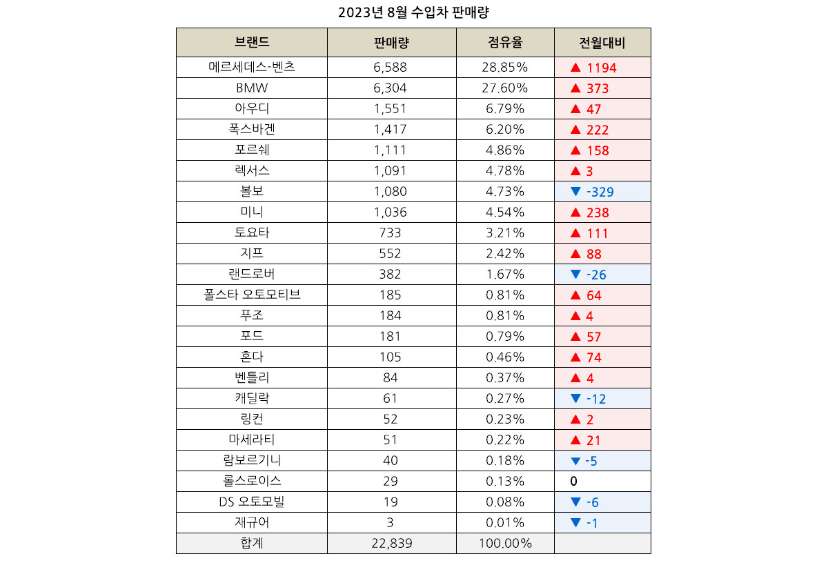 지난 8월 수입차 판매순위를 안내해 드립니다. 국내에서 어떤 차량이 가장 많이 팔렸는지 확인해보자!! 8월 브랜드별 수입차 판매량과 8월 1위부터 30위까지의 수입차 순위를 간단히 살펴보자. 8월 브랜드별 수입차 판매량